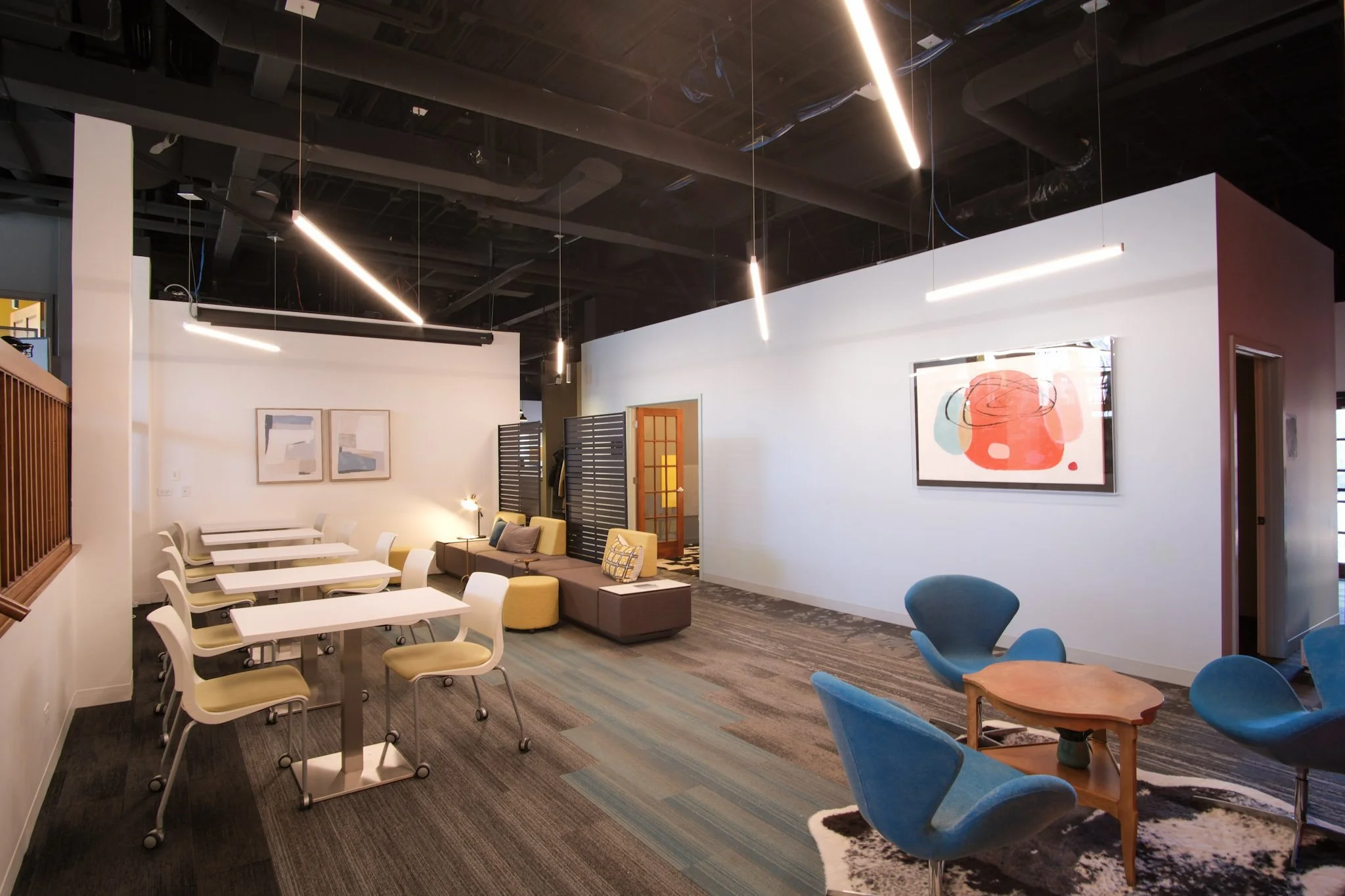 For a while, I had been observing where people naturally gravitated in space and where they didn’t. The first-floor flex area sits in a major traffic zone and right outside one of our busiest meeting rooms, which made it feel less comfortable for focused work. I wanted to reset that area so it felt more inviting and a little more tucked away, while still keeping those spontaneous interactions that are so important in a coworking space. At the same time, we needed to better define areas for heads-down work versus collaboration.